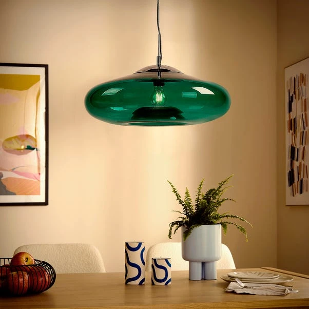 In a striking green colourway, this pendant light features a glass shade and a polished chrome metal gimbal. It’s the ideal statement piece to add a pop of colour to any room.